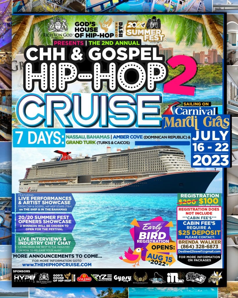 Rich Von God Productions, God’s House of Hip Hop Radio in association with God’s House of Hip Hop 20/20 Summer Fest presents the 2nd annual CHH and Gospel Hip Hop Cruise with a fun-filled week at sea to the beautiful islands of the Caribbean and this year we have chosen the Carnival Ship, The Mardi Gras! This is the cruise of the year where recording artists from all over from the culture will come together to fellowship, entertain, and deliver the music ministry in a way unlike no other while having fun for 7 Days.