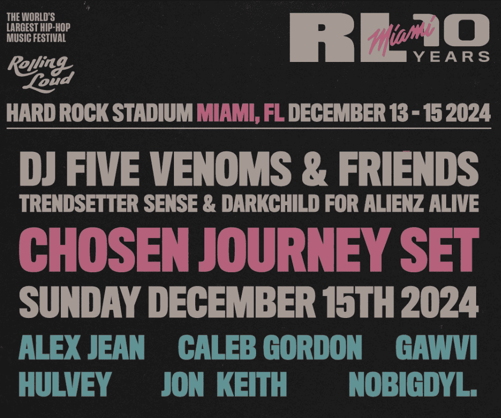 Rolling Loud Miami’s 10th Anniversary is set to break new ground on Sunday, December 15th, with the debut of the first-ever Christian Hip Hop set, Chosen Journey. Curated by DJ Five Venoms, Trendsetter Sense, and Rodney “Darkchild” Jerkins, this milestone performance will feature Alienz Alive artists Jon Keith, GAWVI, and Alex Jean, alongside Caleb Gordon, Hulvey, and nobigdyl.