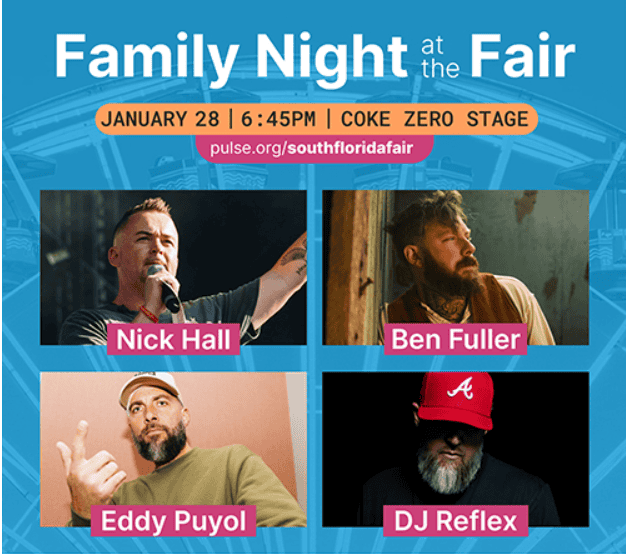 Join us on January 18th for an unforgettable Family Night at the South Florida Fair, sponsored by Pulse Evangelism. This exciting event brings together music, ministry, and inspiration for the whole family. Experience a powerful lineup featuring multi-genre recording artist Eddy Puyol, renowned for his unique blend of Christian Hip Hop and worship. Puyol will take the stage alongside dynamic speakers like Nick Hall, founder of Pulse, and acclaimed Christian singer Ben Fuller.